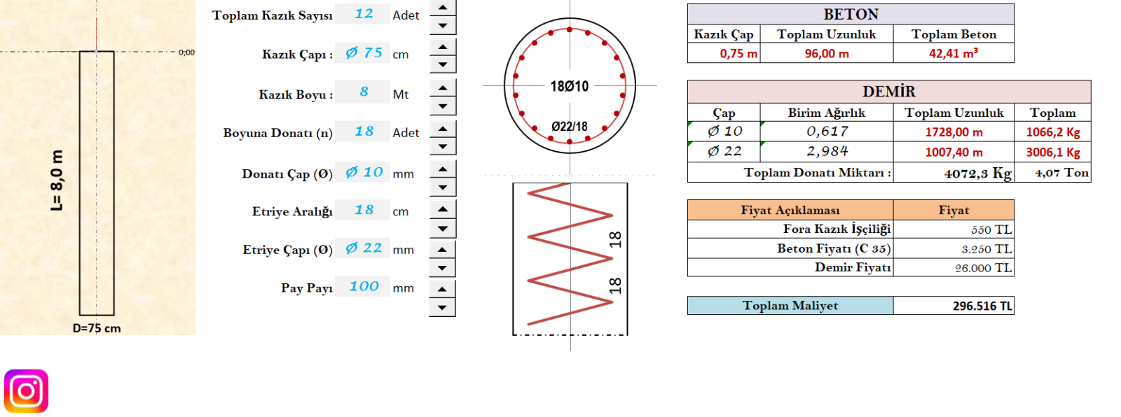 Fore Kazık Demir Beton Hesabı Excel Dosyası